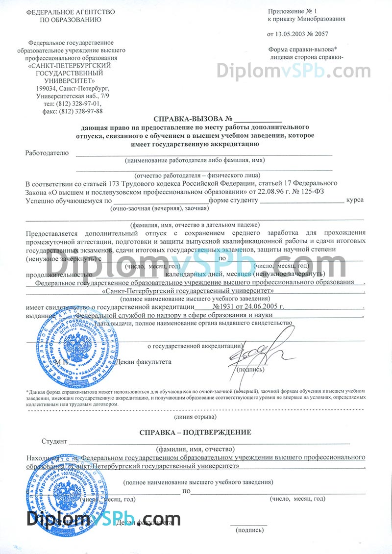 На нашем сайте Вы можете купить справку-вызова на сессию, выданную любы инститом, университетом или академией Санкт-Петербурга. Справка будет изготовлена по образцу, актуальному для выбранного Вами учебного заведения, заверена гербовой печатью и необходимыми подписями.